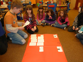 Yesterday I posted about the awesome research strategy I had found in Ralph Fletcher's book, Non-Fiction Craft lessons: Teaching Information Writing K-8. I am still really excited about that strategy, but noticed yesterday afternoon that most of my students were only focusing on one, maybe two, of the categories for their habitat research. I started brainstorming and came up with a visual for them to use that would help them organize their notes and let them see if they had facts about each category. I find that the more hands on and visual the better this class does. I took a large piece of butcher paper and folded it into fourths. Then I labeled each square with the categories the children are supposed to be finding information for. One of our research groups volunteered to organize their facts on their chart for us this morning. They discovered that they only had information for the animals that lived in their habitat. "Uh-oh!" they said. This afternoon they are more focused and more confident!